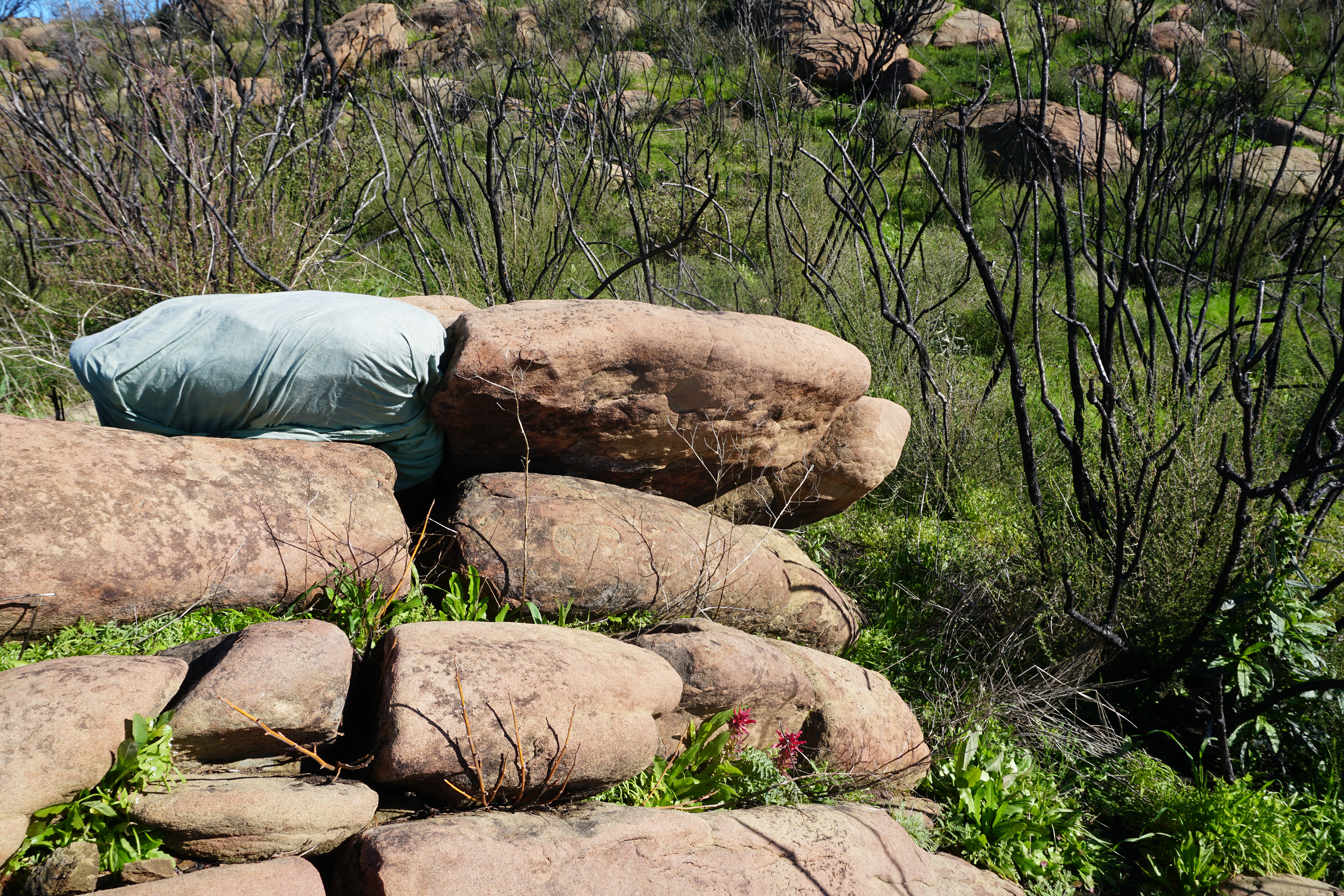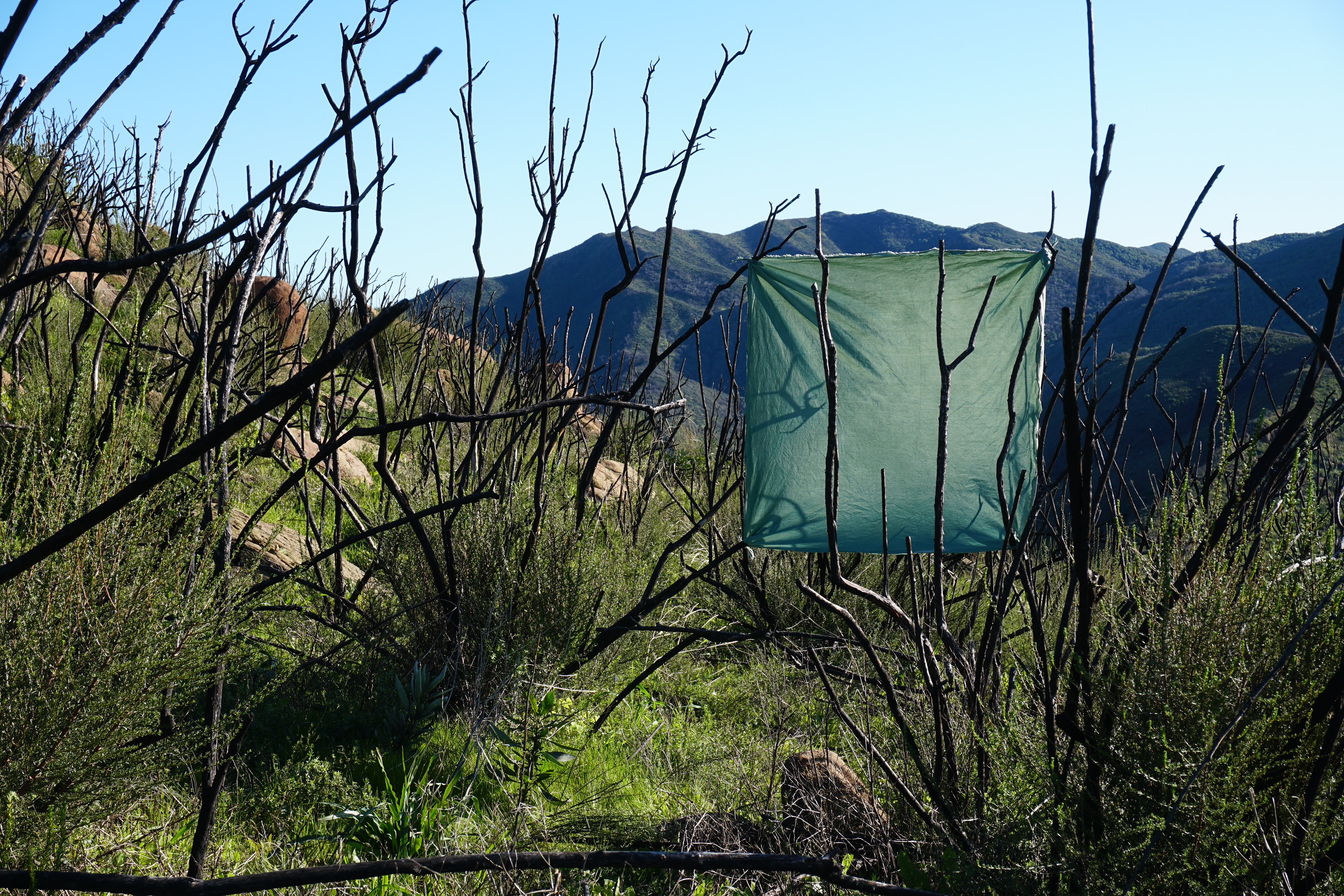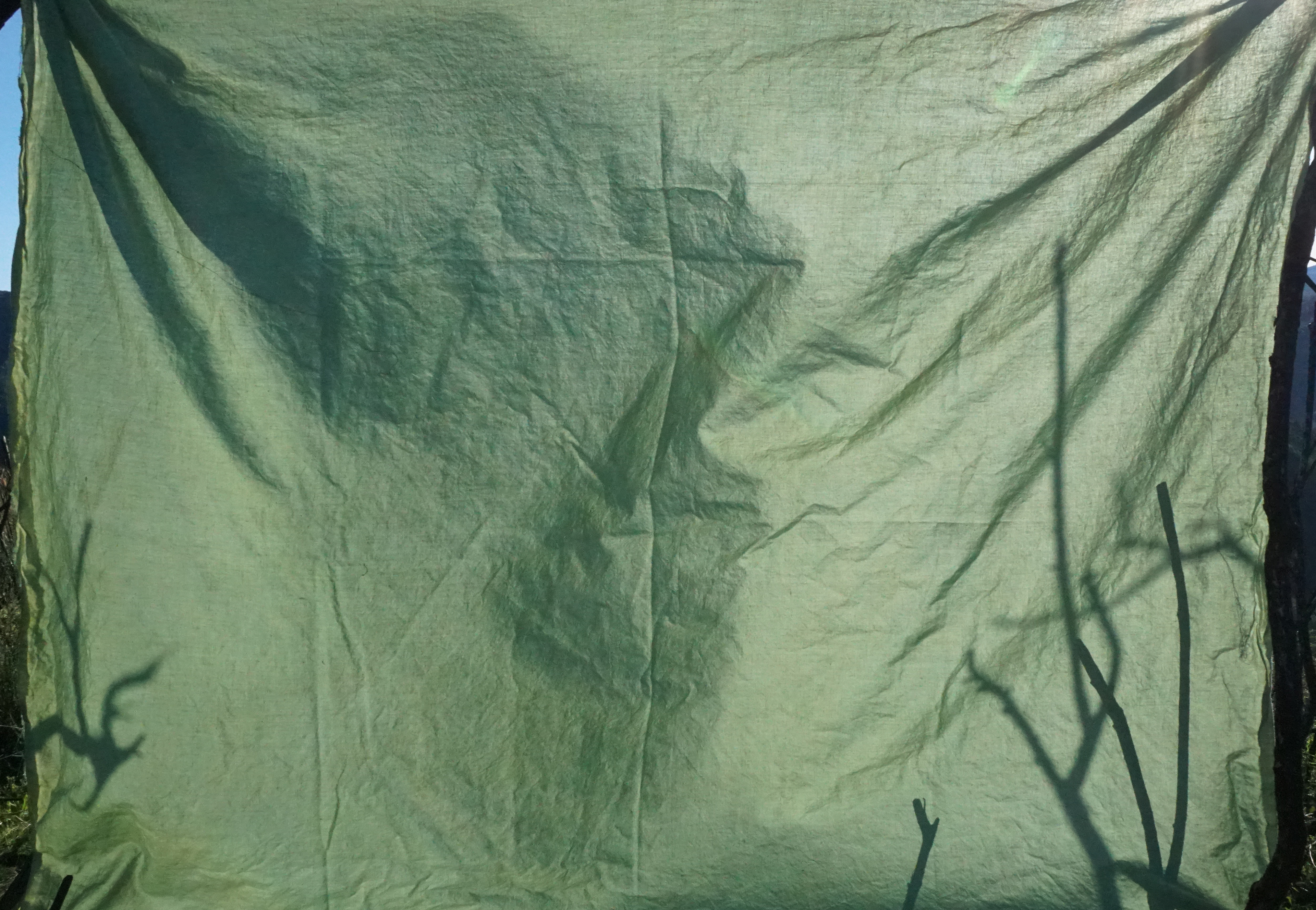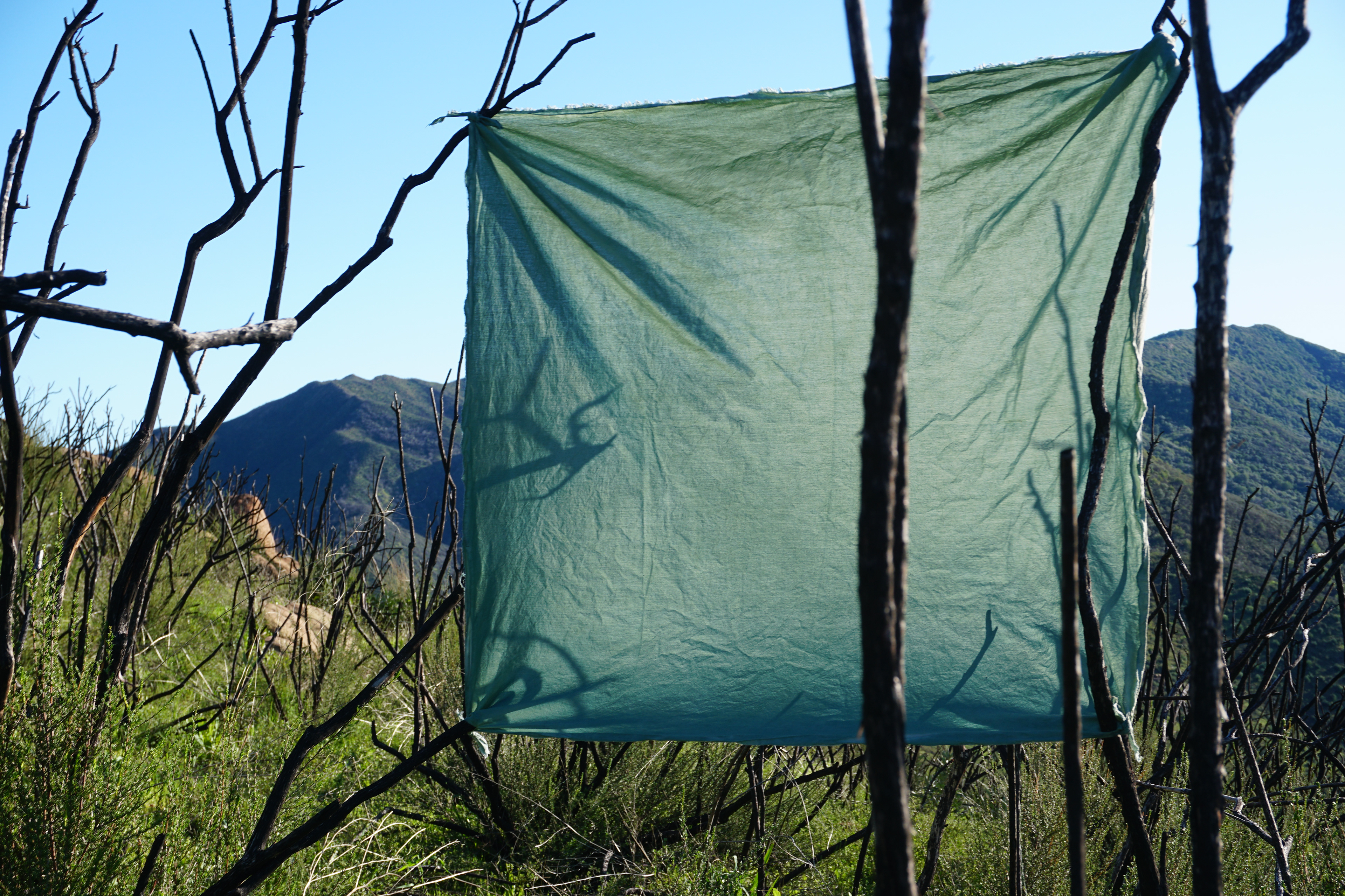 Stebbins Cold Canyon is a natural reserve area within UC reserve system, located in the Blue Ridge Berryessa Natural Area. The landscape was burned by the Wragg wildfire in July of 2015. Nearly a year and half after the fire, the landscape was blanketed in new growth and yet the effects of the fire are still in clear view. The stark black bones of burned manzanita stand prominently. Light sensitive cyanotype fabric was installed on location to be witness to the sunlight, the wind and the shadows of surrounding forms.